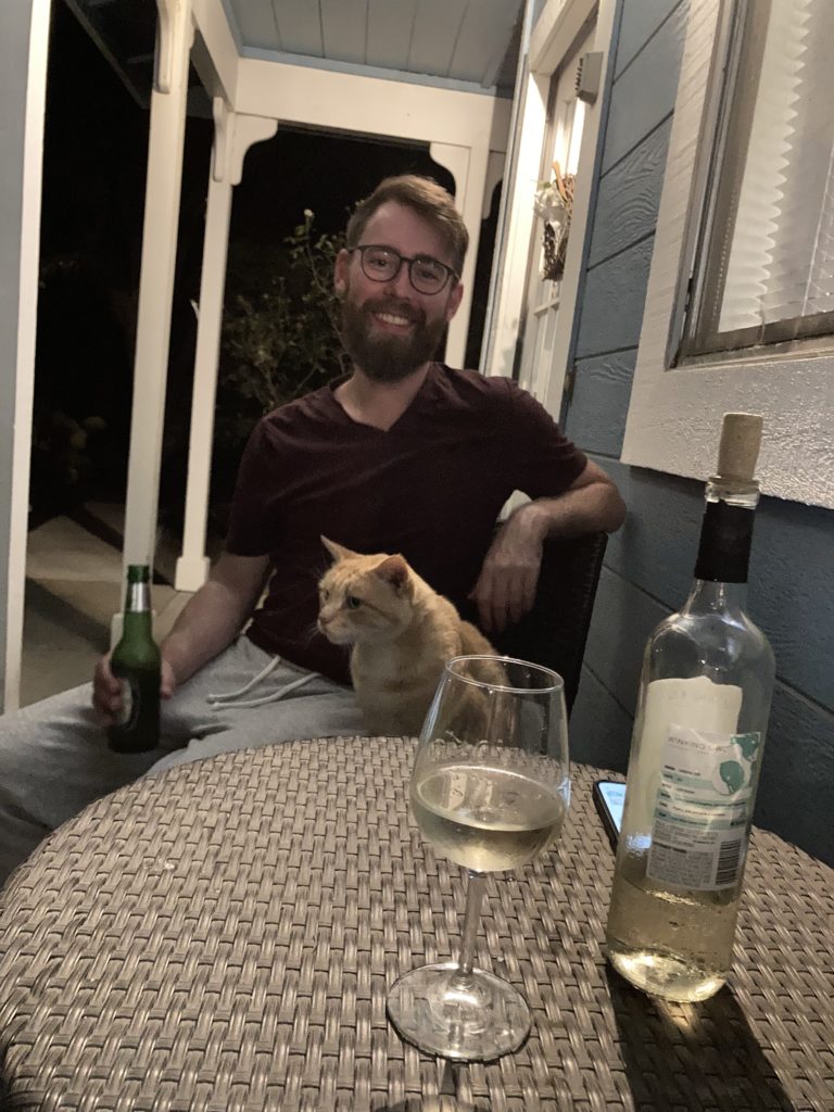 Unser Abendessen nahmen wir in Gesellschaft von Dave ein, der zuweilen anklagend um unsere Beine strich, weil wir nichts fallen ließen. Dann gab es einen großen Schreck und Lärm vom Bäumchen in unmittelbarer Nähe und es krabbelten zwei Waschbären heraus. Süß sind die ja, aber wohl auch nicht ungefährlich. (Mich erinnerte das gerade daran, wie wir in Polen vor einer Herde Wildschweine ins Häuschen geflüchtet sind, die sich auf unserer Terrasse umsehen wollten. Wir hatten ihre Anführerin Gloria getauft, weil damals eine Wildschweindame namens Gloria an der Ostsee schwimmend Schlagzeilen machte.) Wir haben besser unsere Reste schnell hineingebracht. Vielleicht stehen die modernen kalifornischen Hipster-Waschbären auf Pasta mit Pesto und Sauvignon Blanc.
